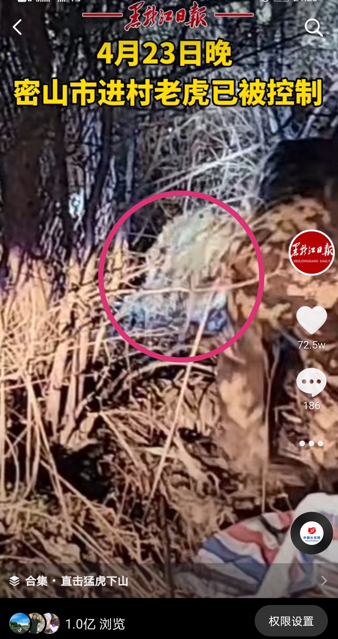 2021年4月23日,黑龍江省密山市白魚灣鎮(zhèn)臨湖村“驚現(xiàn)”一只成年野生東北虎......接下來,這只“進村虎”引發(fā)了全國媒體的關(guān)注,黑龍江日報報業(yè)集團旗下各媒體也積極跟蹤事態(tài)發(fā)展。其中,黑龍江日報抖音號推送的《最新進展!密山市進村老虎已被控制!》單條瀏覽量突破1個億,登上抖音熱點榜TOP3,并獲得抖音“熱點人氣作者”稱號。黑龍江日報和龍頭新聞抖音號分別推出了“直擊猛虎下山”專輯,截至記者發(fā)稿時,15條短視頻的總播放量已接近兩億。