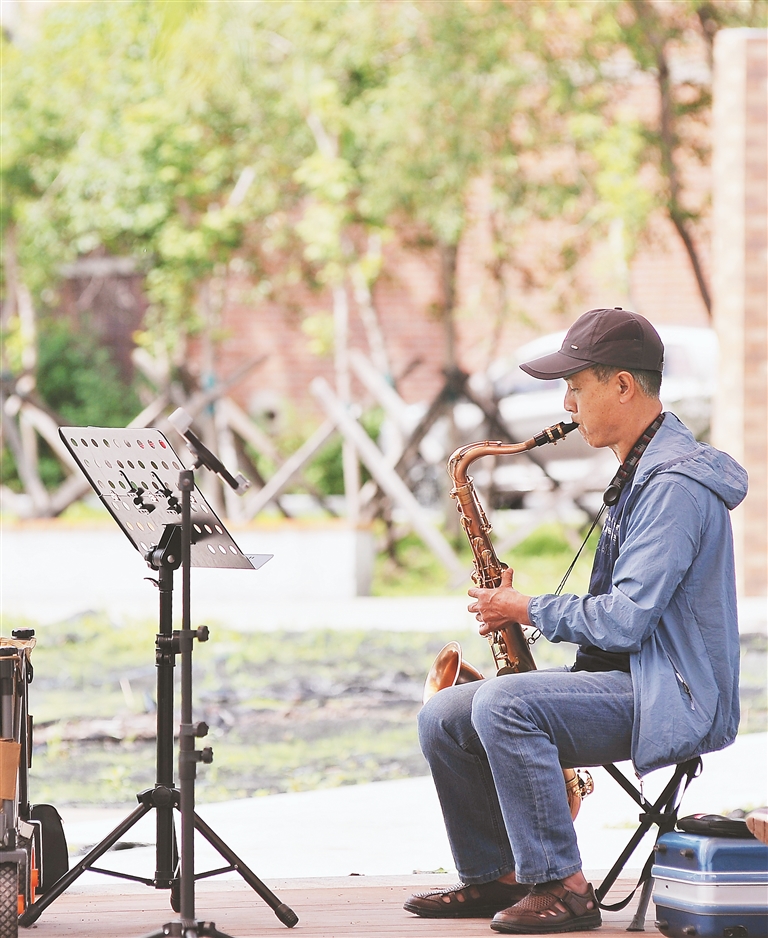 居民在光影時代公園里吹奏樂器。