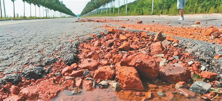 為何道路會在短時間內(nèi)出現(xiàn)破損?一位業(yè)內(nèi)人士稱,除了排水不暢影響路面使用壽命外,大型工程車輛碾軋嚴(yán)重,而建設(shè)單位又沒有執(zhí)法權(quán),加劇了道路破損。