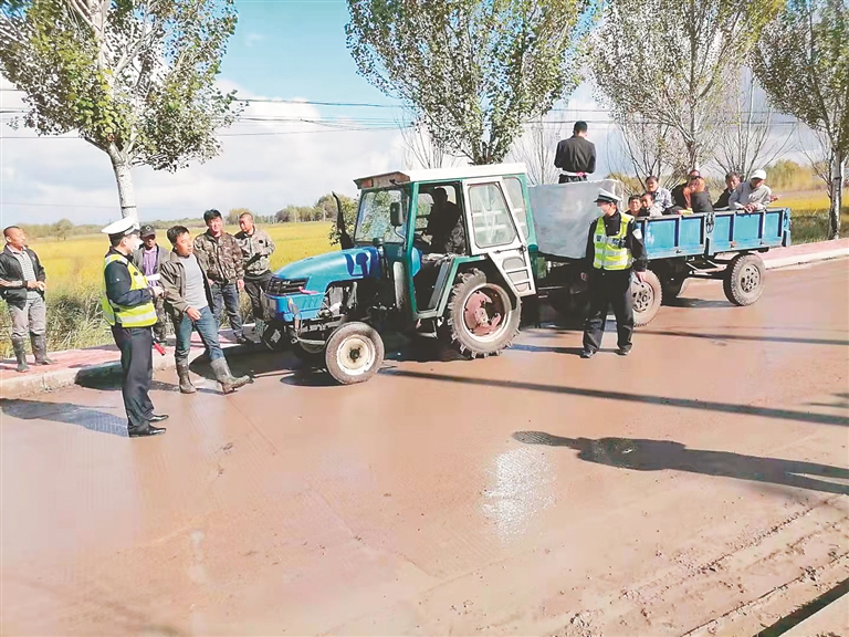 10日5時(shí)38分,富裕公安局交通管理大隊(duì)執(zhí)法人員在富裕龍安橋鎮(zhèn)小河?xùn)|一公里處,發(fā)現(xiàn)農(nóng)用拖拉機(jī)上載人行駛,立即進(jìn)行截停。經(jīng)查該車載有17人去附近村屯辦喪事,車主還沒有帶駕駛證。執(zhí)法人員讓車上人員自行離開,并對四輪車駕駛員進(jìn)行處罰。