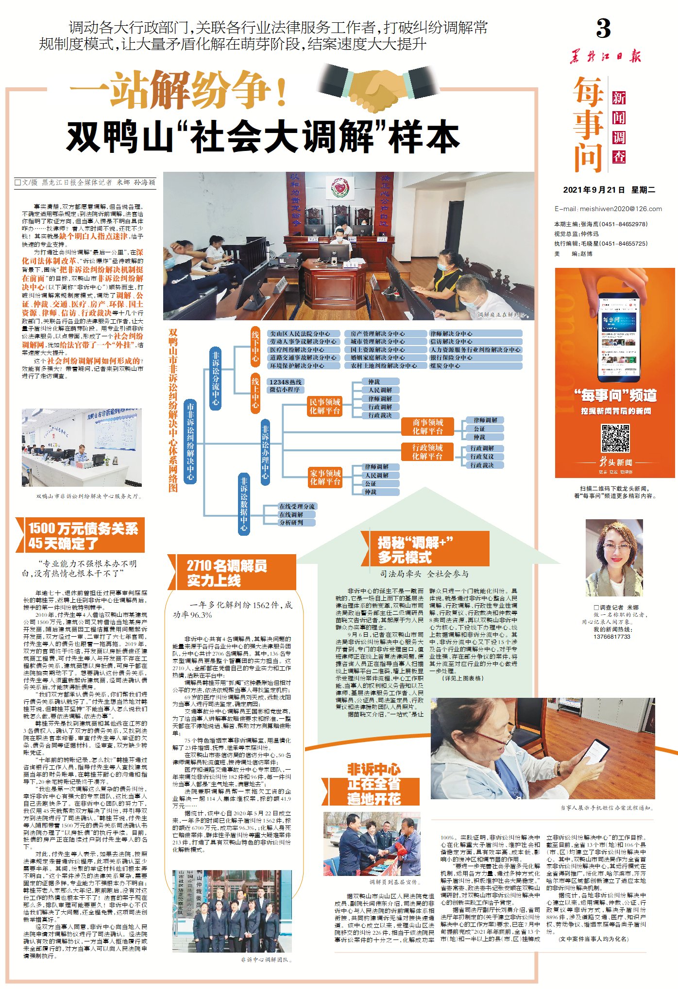 非訴中心的誕生不是一蹴而就的,它是一場自上而下的基層法律治理體系的新變革,雙鴨山市司法局政治警務(wù)部主任二級調(diào)研員苗曉文告訴記者,其起源于為人民群眾辦實事的理念。