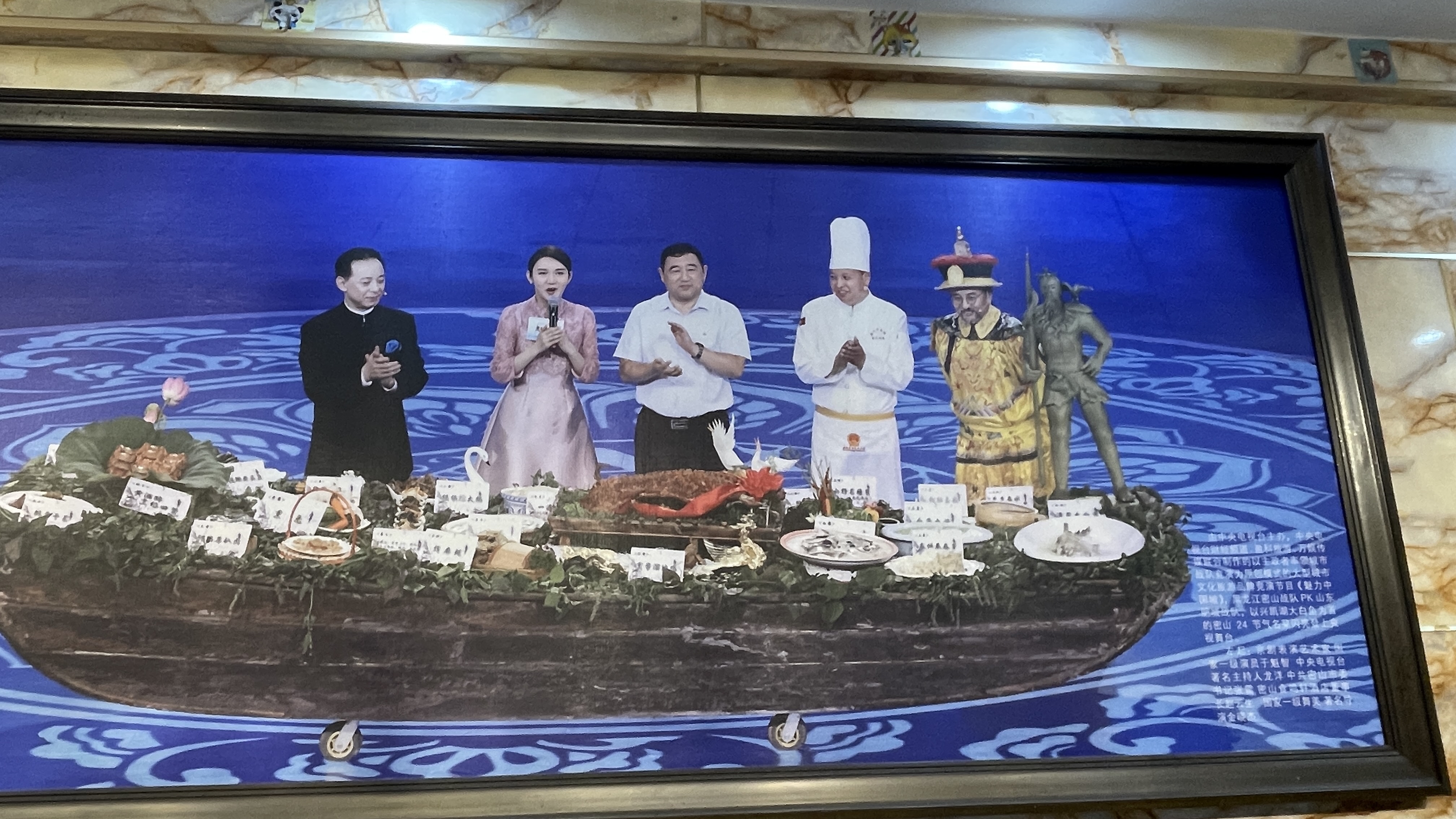 趙云生(右二)將做客央視的圖片,放在飯店最顯眼的位置